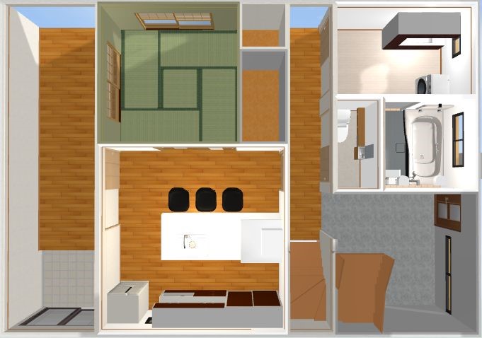 居間を兼ねるキッチンからトイレ、キッチンから洗面~浴室への動きを考え、この間取りにしました。内装壁、床も全て新しくなりました。